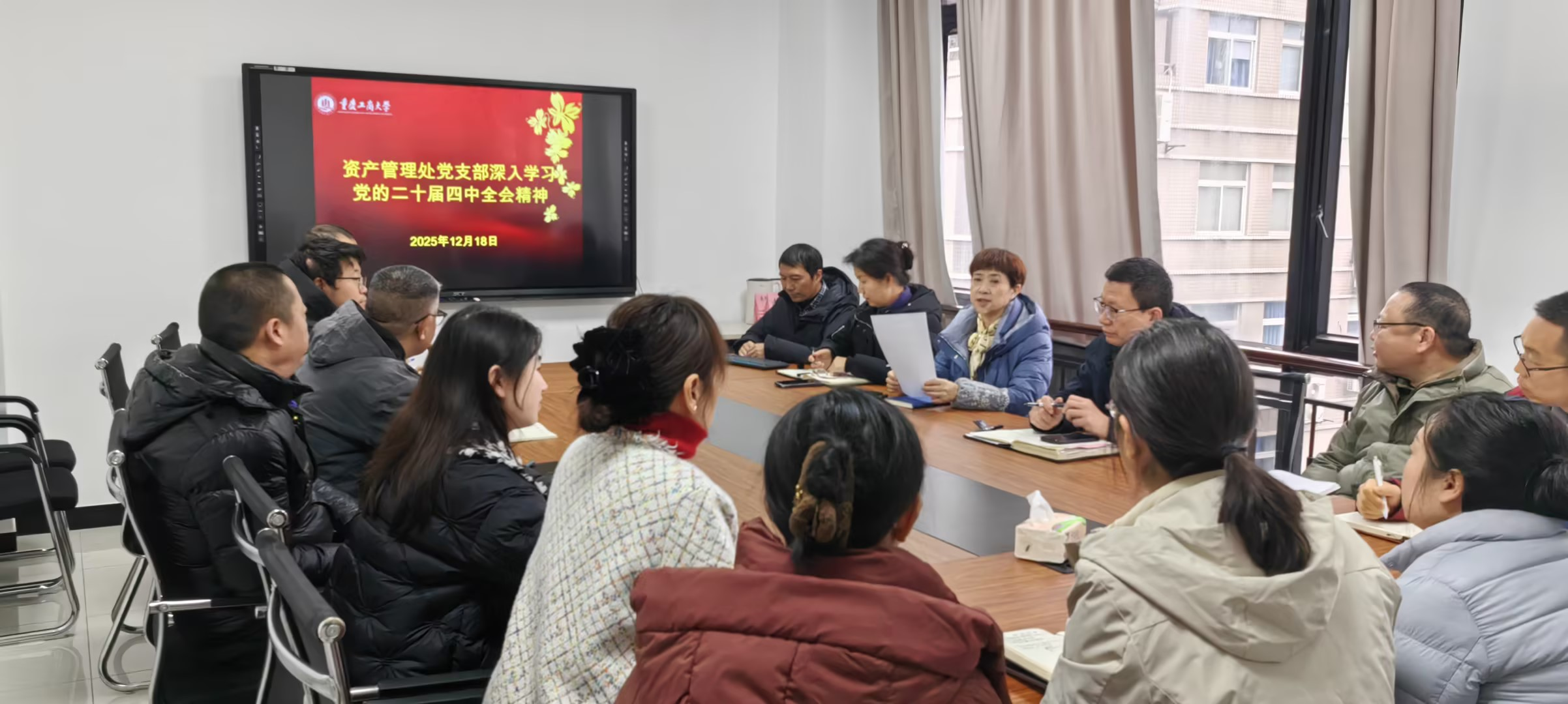2025年12月18日上午,资产管理处支部书记陈永丽处长在厚德楼8001会议室组织全体教职工学习、领会党的二十届四中全会精神。