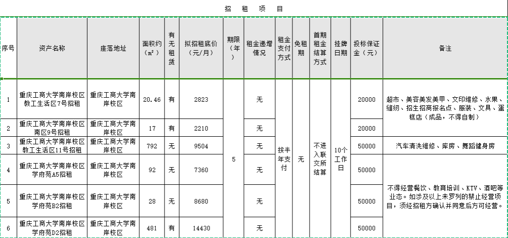 为充分合理利用学校资源,经重庆工商大学研究,决定委托重庆市公共资源交易中心(重庆联合产权交易所集团)对重庆工商大学南岸校区教工生活区7号招租等6处资产进行公开招租,受托方于2025年10月23日在重庆联合产权交易网发布招租公告,招租具体内容和要求详见重庆产权交易网,请潜在竞租人自行查询。