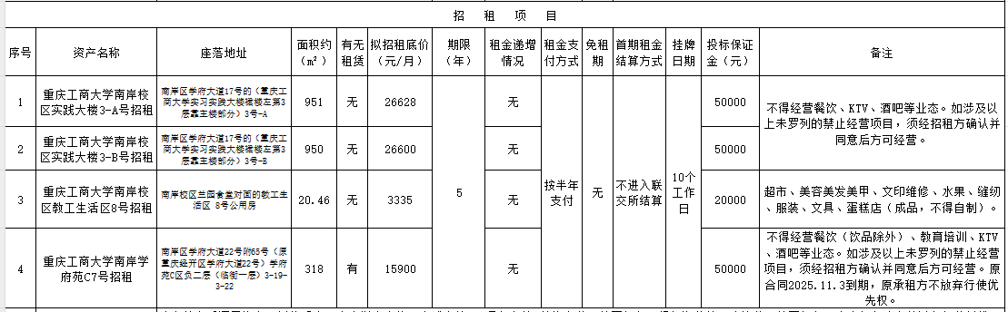 为充分合理利用学校资源,经重庆工商大学研究,决定委托重庆市公共资源交易中心(重庆联合产权交易所集团)对重庆工商大学南岸校区实践大楼3A招租等4处资产进行公开招租,受托方于2025年11月13日在重庆联合产权交易网发布招租公告,招租具体内容和要求详见重庆产权交易网,请潜在竞租人自行查询。
