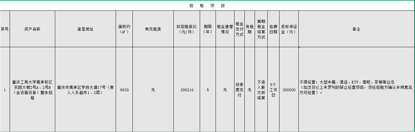为充分合理利用学校资源,经重庆工商大学研究,决定委托重庆市公共资源交易中心(重庆联合产权交易所集团)对重庆工商大学南岸校区实践大楼2号A、2号B整体进行公开招租,受托方于2026年3月27日在重庆联合产权交易网发布招租公告,招租具体内容和要求详见重庆产权交易网,请潜在竞租人自行查询。