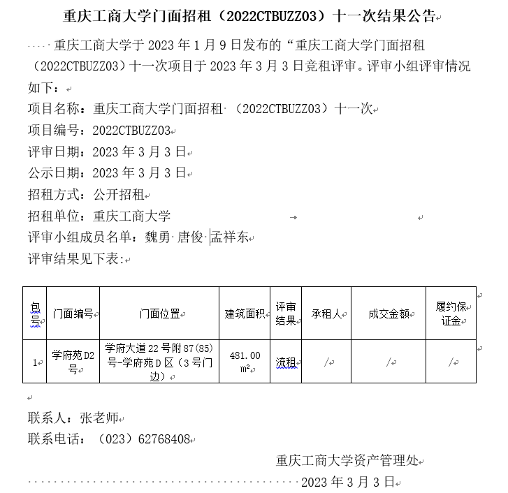 重庆工商大学门面招租(2022CTBUZZ03)十二次结果公告